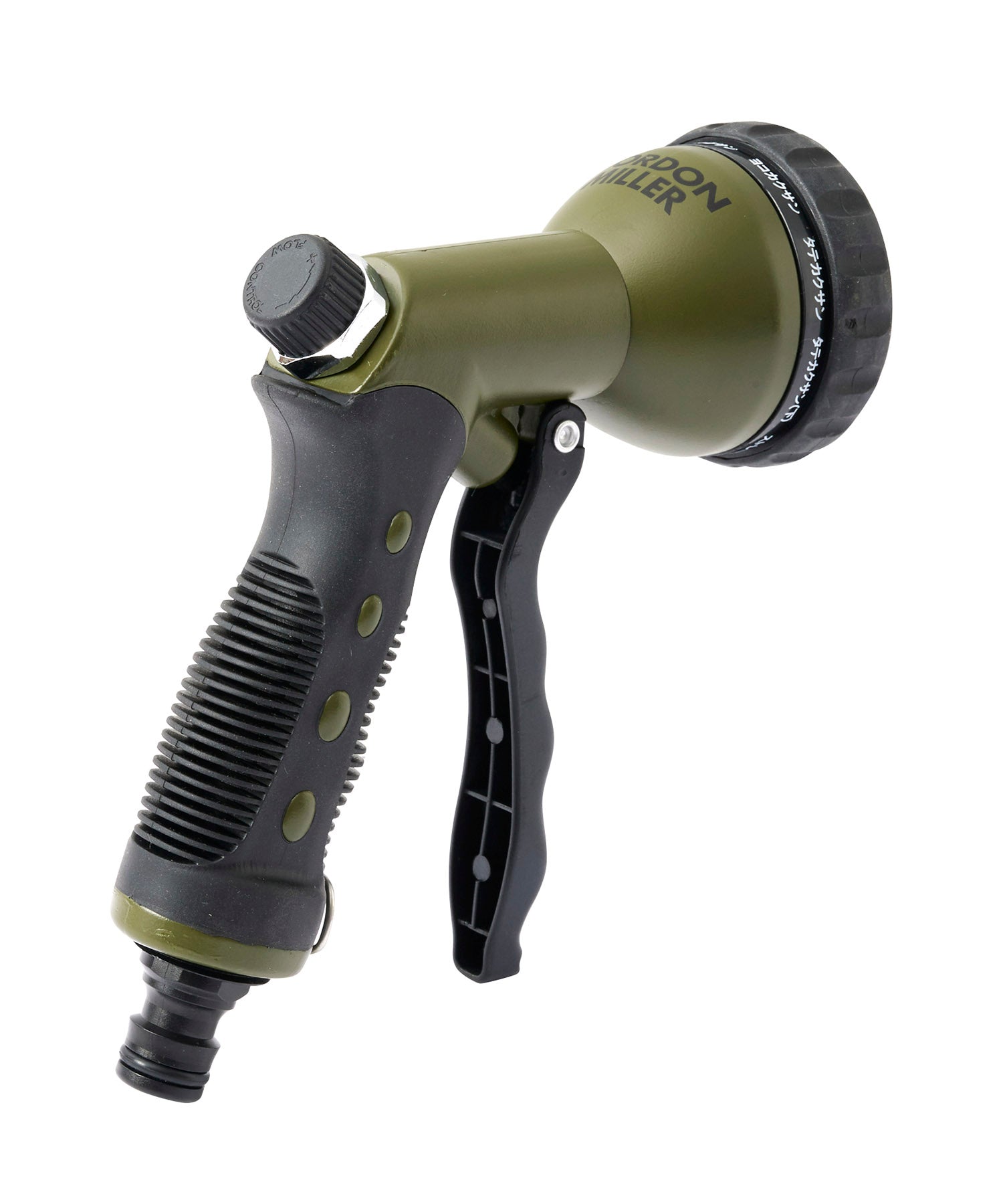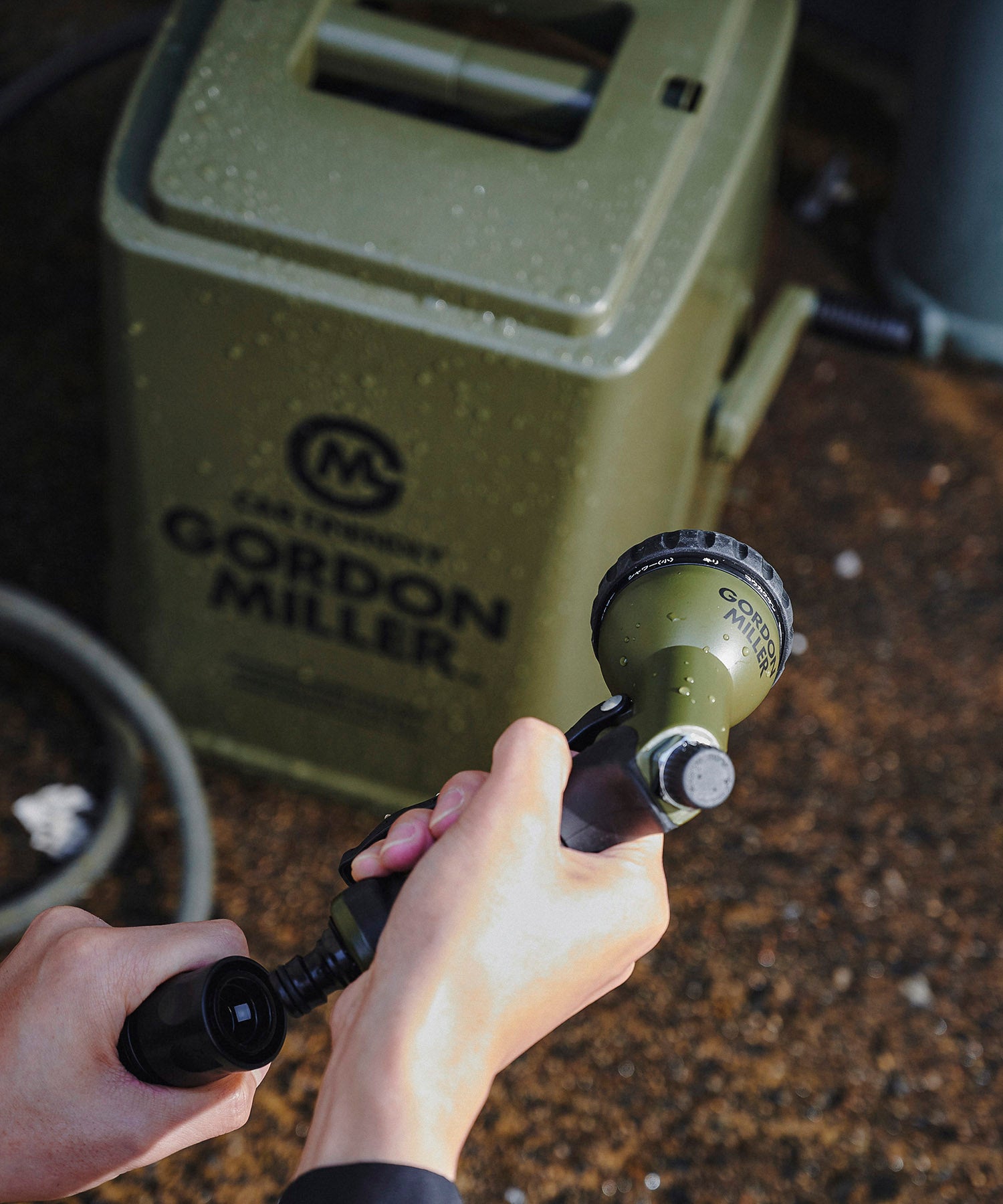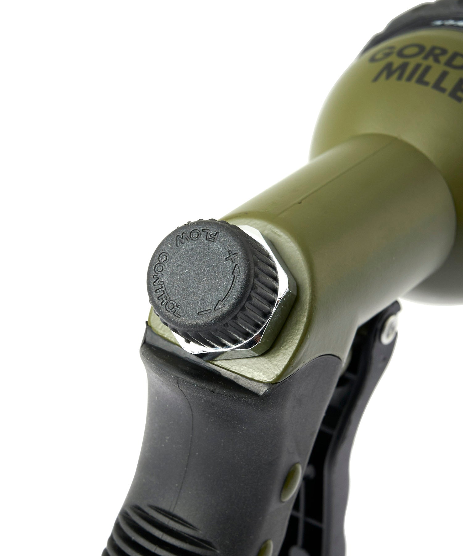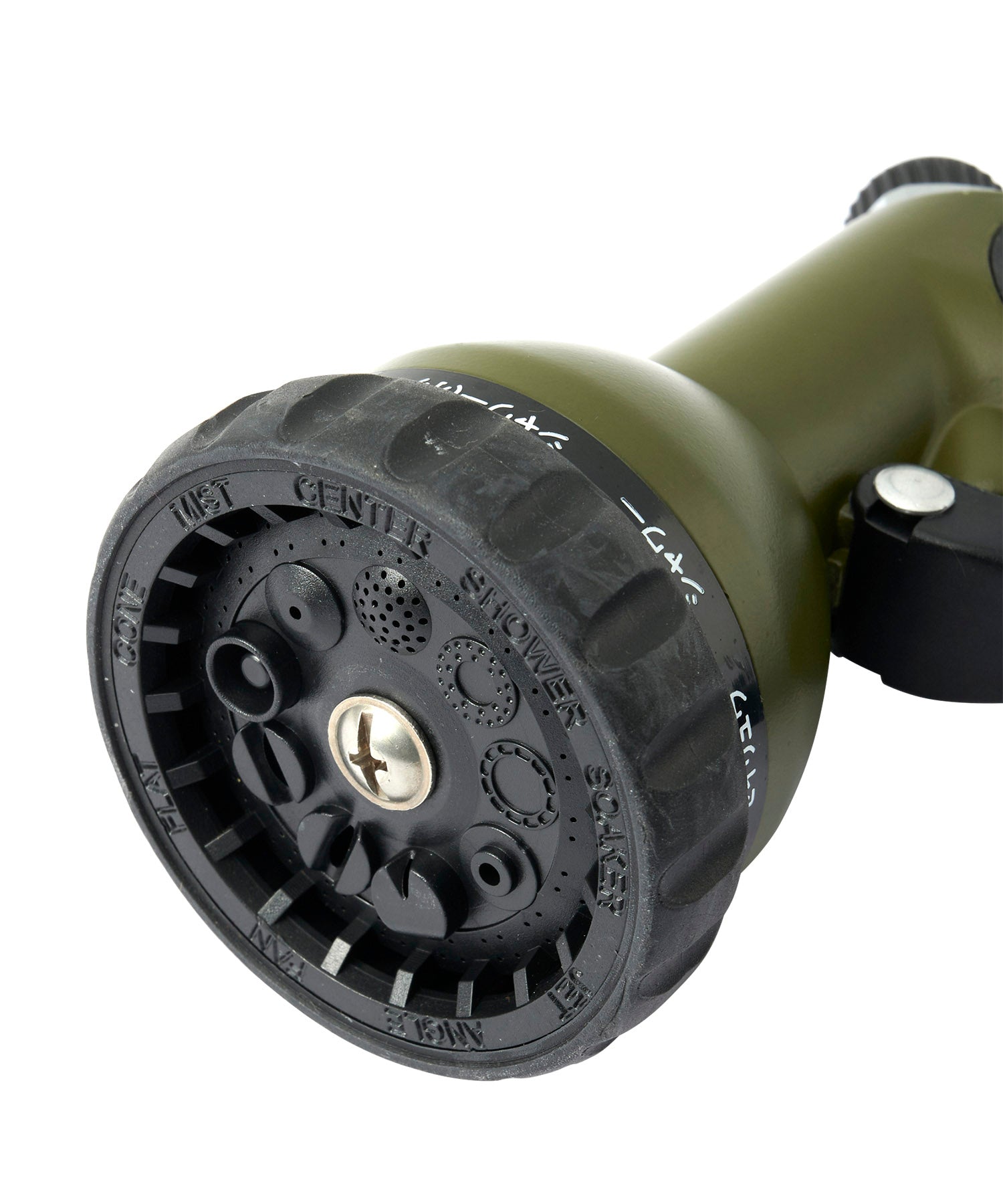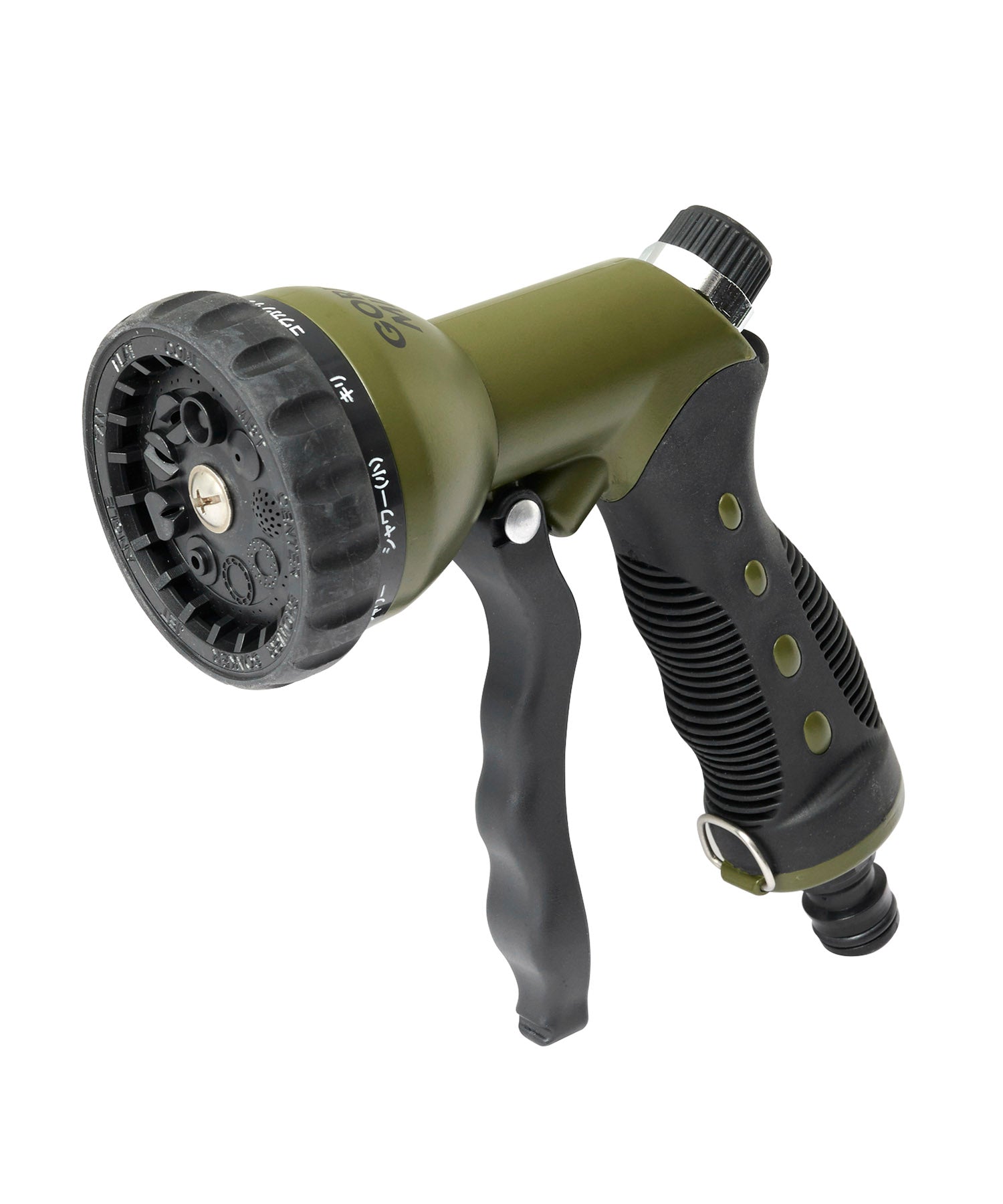 GORDON MILLERオリジナル:フルカバーホースリールとステンレスウォーターホースに取り付け可能な別売りの「交換用ノズル」。オリジナルカラーのOLIVEDRABで洗車や散水など、用途に合わせて9種類の水形パターンが選択できます。