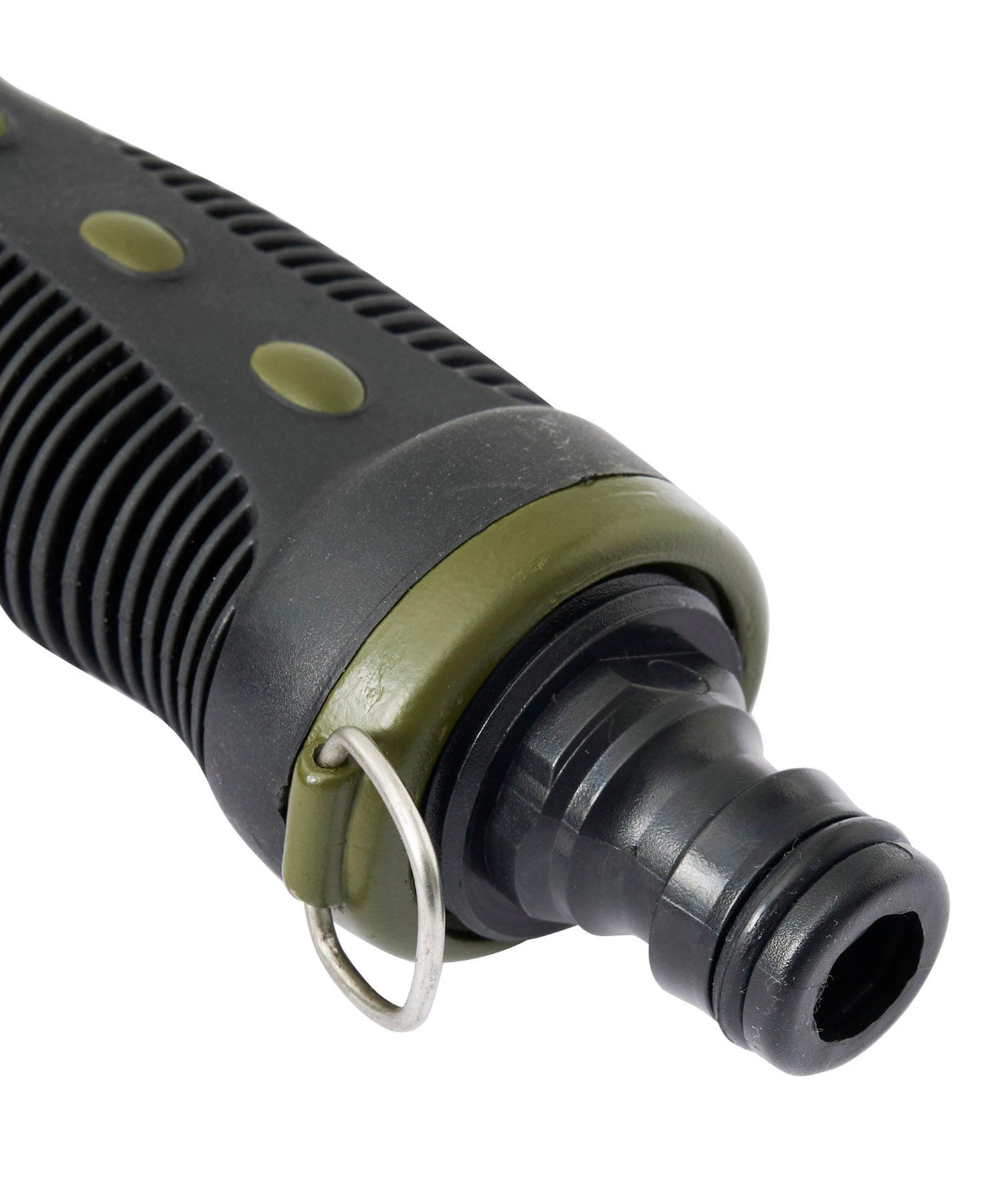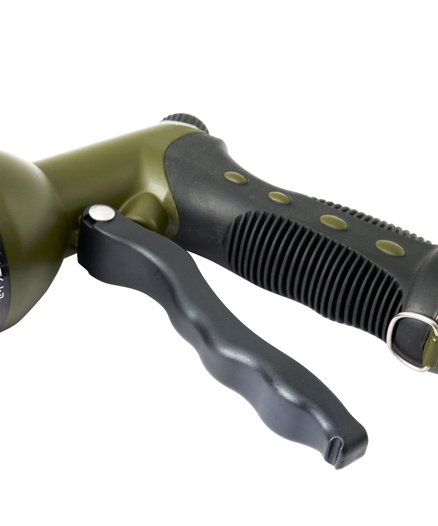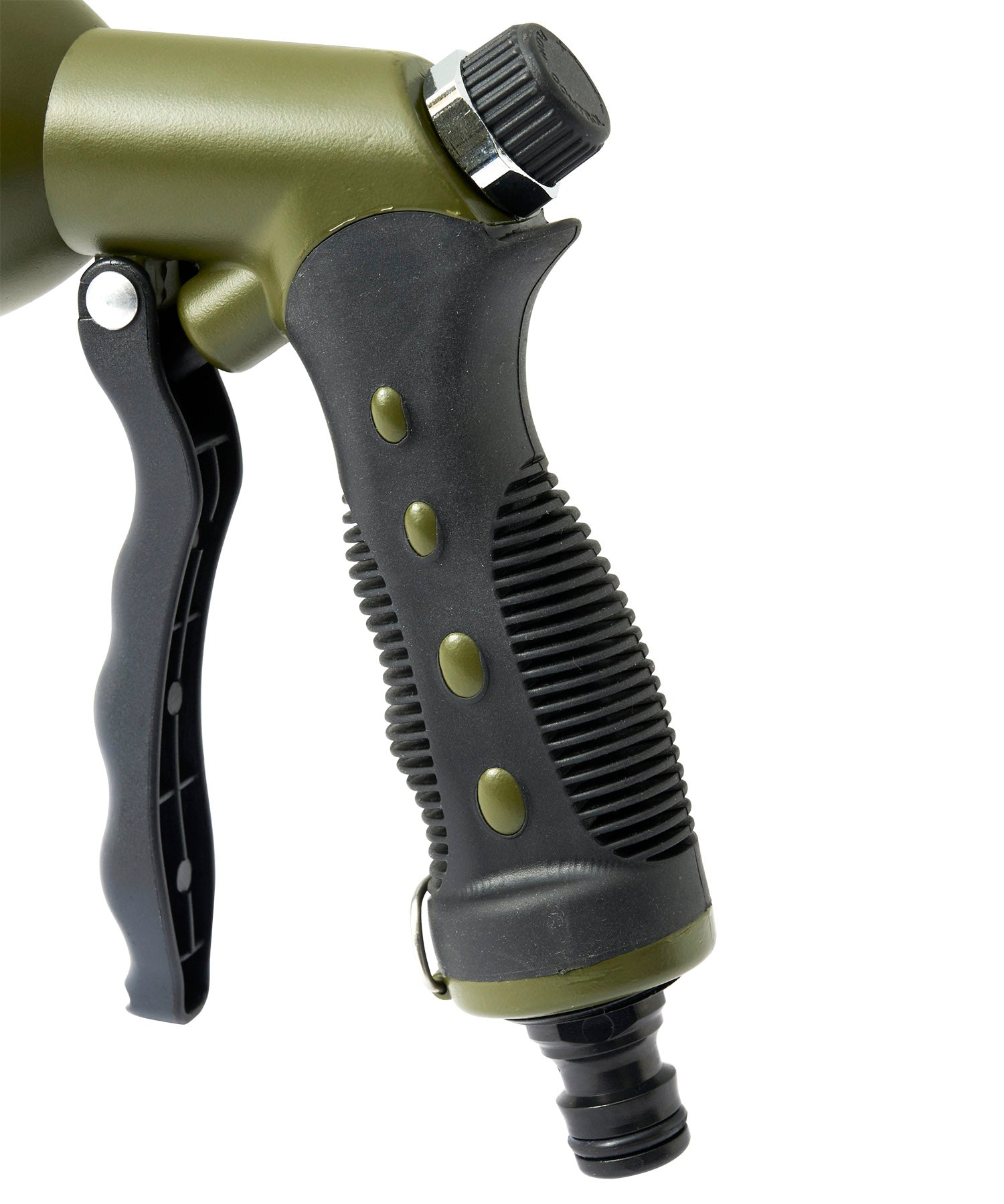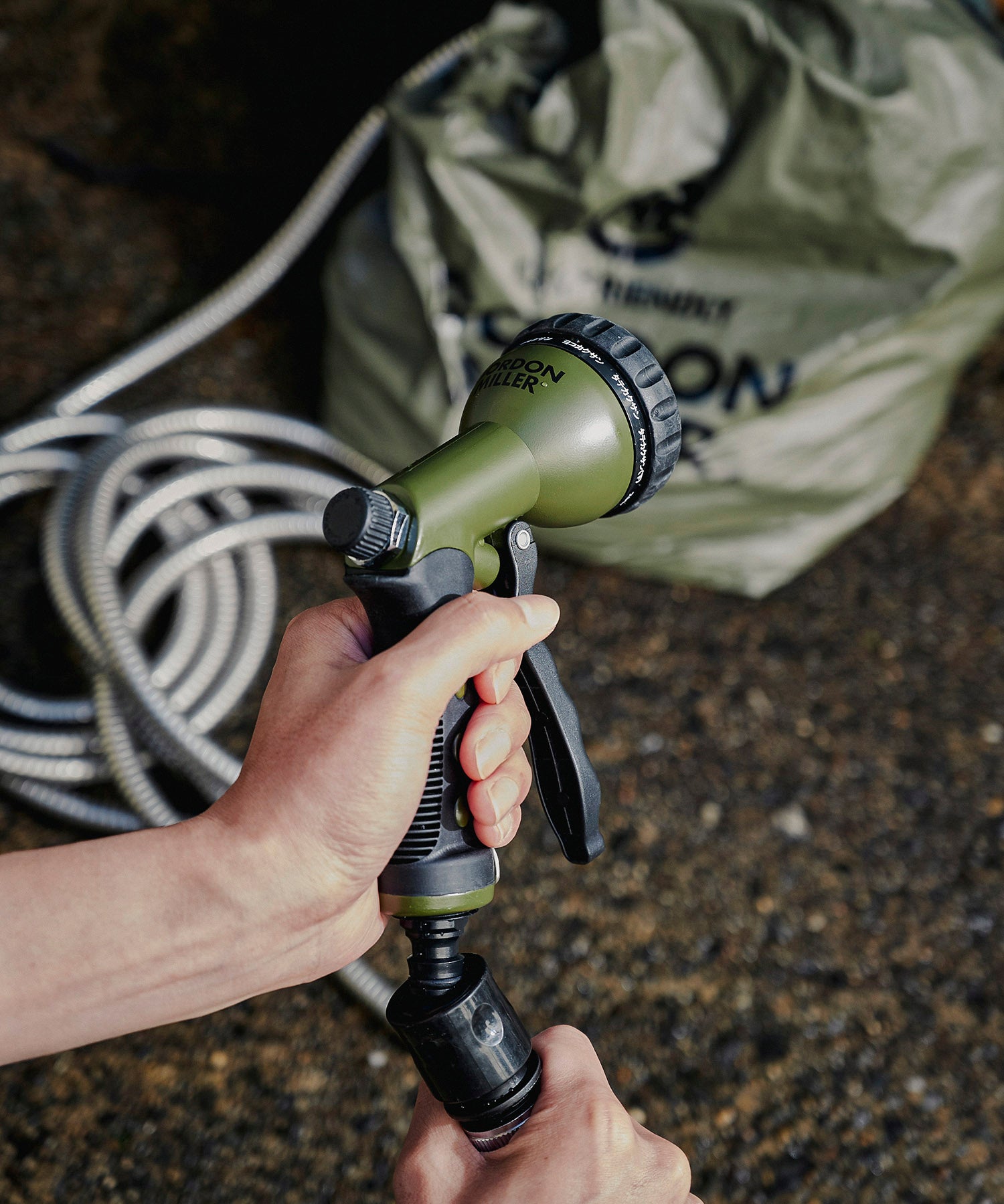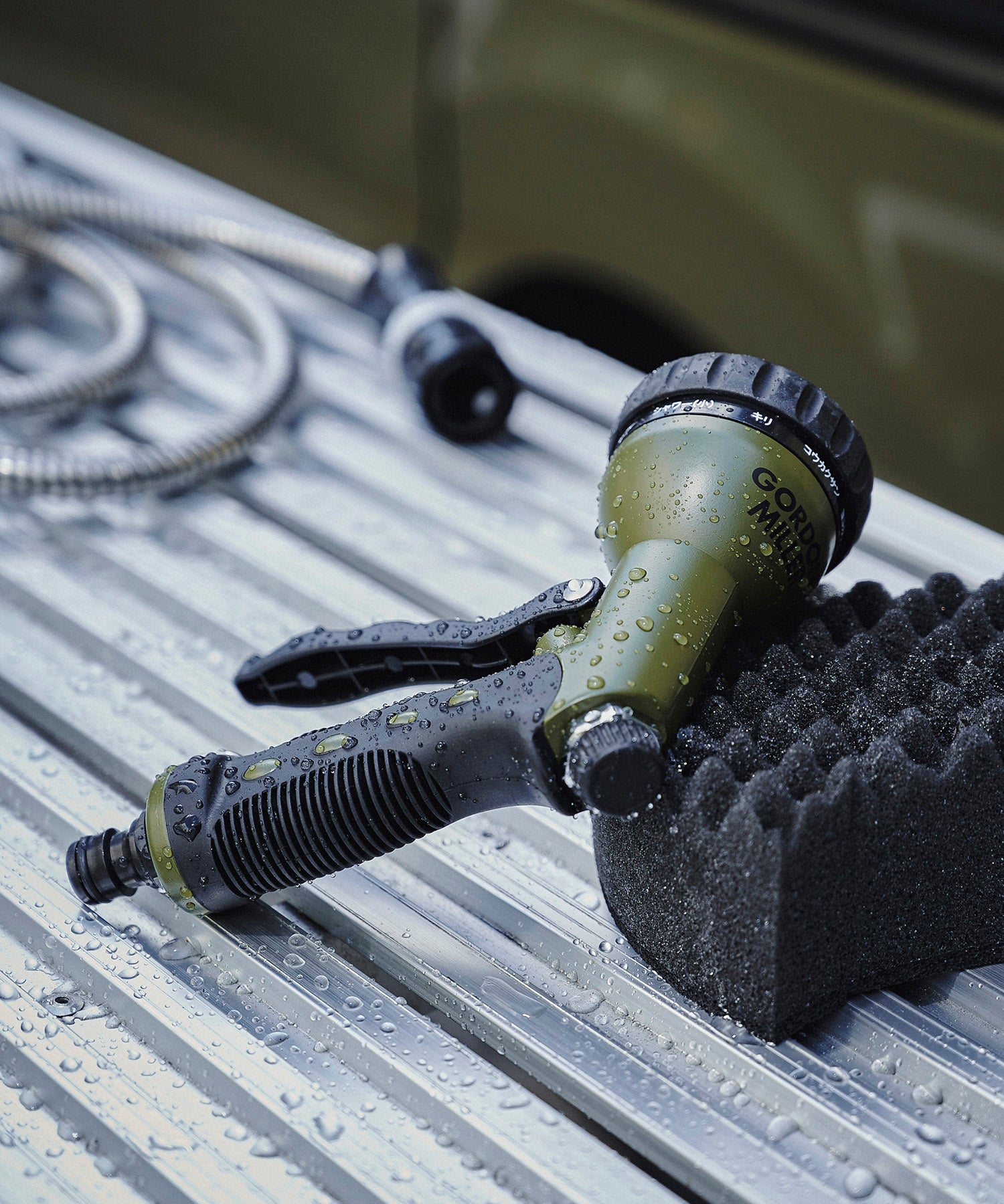 GORDON MILLERオリジナル:フルカバーホースリールとステンレスウォーターホースに取り付け可能な別売りの「交換用ノズル」。オリジナルカラーのOLIVEDRABで洗車や散水など、用途に合わせて9種類の水形パターンが選択できます。