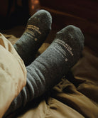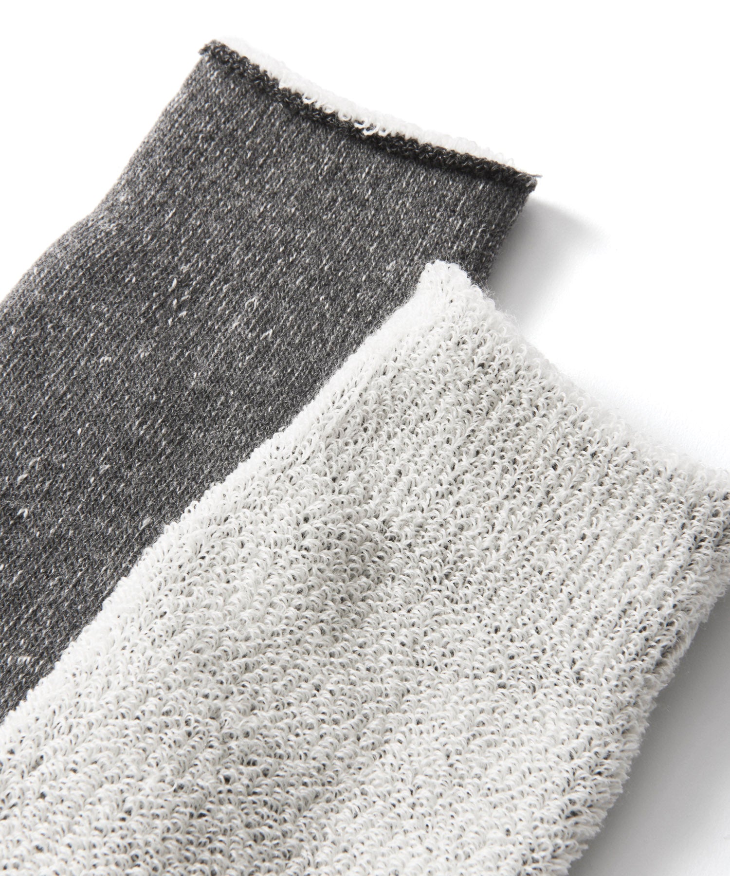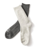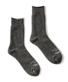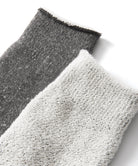 日本の旧式編機により時間をかけて丁寧に編み立てられたソックスです。外側はコットン、内側にメリノウールのパイル糸を使ったダブルフェイス仕様。メリノウールとはメリノ種の羊から取れる高品質な天然繊維。冬は暖かく、夏は快適に過ごせる特性があります。吸湿性や速乾性にも優れており、ウール特有のチクチクした感じがなく、ふんわりやわらかくあたたかい履き心地です。やさしい肌ざわりで日常使用はもちろん、寒いシーズンの車中泊やキャンプで愛用いただけます。